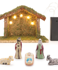 Traditional nativity scenes are a timeless staple in any Christmas display. The barn is made of wood decorated with decorative moss and 5 battery operated warm white LED lights measuring 14 x 9.5 x 6cm. The fairy lights are detachable and require 2 x AA batteries (not included). The 5 ceramic nativity figures include: Mary, Joseph, Baby Jesus, a donkey & a cow and can be arranged in the barn however you like. Designed and manufactured exclusively for Christmas Concepts.