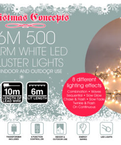 Brighten up your Christmas display with these stunning cluster lights, perfect for both indoors and outdoors. The cluster light measures 6m/20ft in length with a 10m/33ft lead wire. With 8 function controller box: Combination, In Waves, Sequential, Slow Glow, Chase/Flash, Slow Fade, Twinkle / Flash & Steady On. The lights come in a durable storage box, keeping them in great condition to use year after year. BS indoor transformer. Super energy efficient giving you on the the highest energy ratings saving you money year after year. Designed and manufactured for Christmas Concepts Ltd.