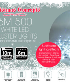 Brighten up your Christmas display with these stunning cluster lights, perfect for both indoors and outdoors. The cluster light measures 6m/20ft in length with a 10m/33ft lead wire. With 8 function controller box: Combination, In Waves, Sequential, Slow Glow, Chase/Flash, Slow Fade, Twinkle / Flash & Steady On. The lights come in a durable storage box, keeping them in great condition to use year after year. BS indoor transformer. Super energy efficient giving you on the the highest energy ratings saving you money year after year. Designed and manufactured for Christmas Concepts Ltd.