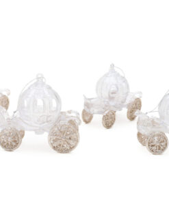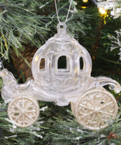 This glitter decorated princess carriage will add the perfect finishing touches to your Christmas display this year. The carriage measures approximately 10cm long with silver hanging string. The carriage has a transparent body with glitter covered wheels for a magical effect. This decoration would be a great addition to any other event for a fairytale and fantasy theme! Designed and manufactured exclusively for Christmas Concepts Ltd