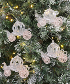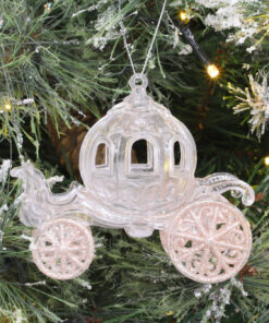 This glitter decorated princess carriage will add the perfect finishing touches to your Christmas display this year. The carriage measures approximately 10cm long with silver hanging string. The carriage has a transparent body with glitter covered wheels for a magical effect. This decoration would be a great addition to any other event for a fairytale and fantasy theme! Designed and manufactured exclusively for Christmas Concepts Ltd