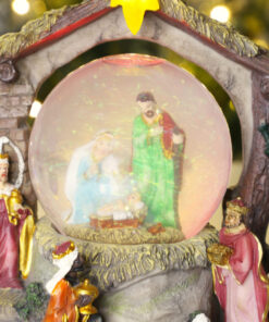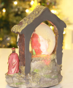 This stunning water globe will be the talking point of your room this Christmas! The globe is encased in a frame decorated as a barn and contains a nativity scene. It has colour changing LED lights, a glittering effect and plays the tune “Away in a Manger” – the LED lights are bright while also being low voltage and energy efficient. The 3 way switch lets you control the lights and music within the beautiful decoration. Product size – 16×13.3×18.7cm. Designed and manufactured exclusively for Christmas Concepts Ltd.