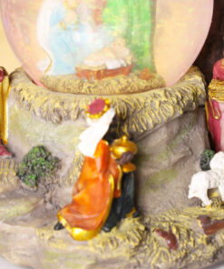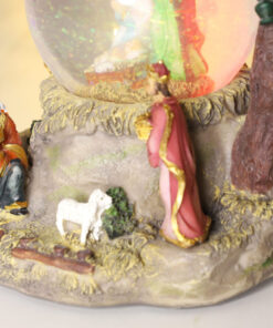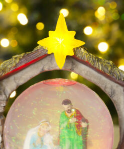 - The globe is encased in a frame decorated as a barn and contains a nativity scene.