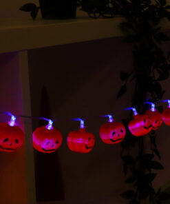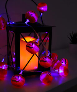 These are fantastic lights for Halloween. There are 20 pumpkins on the set. Each pumpkin measures approx. 4cm x 3cm and has a blue led light. The lights are on clear cable and there is approx. 50cm lead wire from the last light to the battery box. The set of lights require 2 AA batteries. (not included)