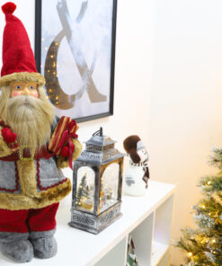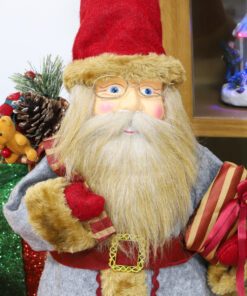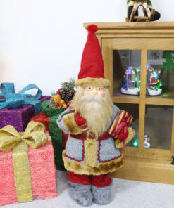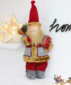 Bring some festive cheer into your home with this standing Santa figure! This jolly character is made with a plush body and a hard plastic face and features telescopic legs which take Santa from 44cm to 58cm. He is dressed in a beautiful traditional outfit including a grey coat with brown fur trim, a red hat, red gloves and red belt with gold buckle. Santas face is brought to life with bright blue eyes, a jolly smile, gold glasses and a long brown beard. He carries a gift in one hand and the other holds a sack topped with decorations that is hung over his shoulder. This Santa would look great standing next to your Christmas tree or as part of a Winter Wonderland theme display! Designed and manufactured exclusivley for Christmas Concepts Ltd.