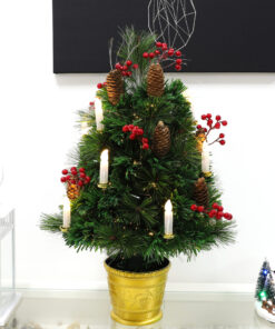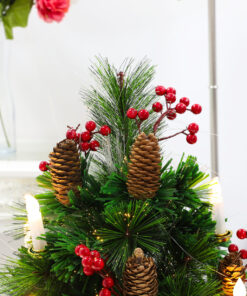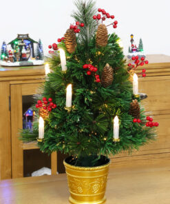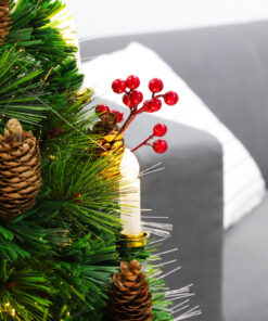 - The fibre optic tree is already decorated with natural pine cones, red berries and static warm white LED candles.