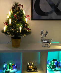 This beautiful tree will look stunning as a centre piece in your home or office! The fibre optic tree is already decorated with natural pine cones, red berries and static warm white LED candles. The appearance of the tree can be changed at the touch of a button with an 8 function light source. It stands at 60cm tall and has a 15.4cm diameter gold plastic pot base. An indoor transformer with 1.8m lead wire are also included with the tree.