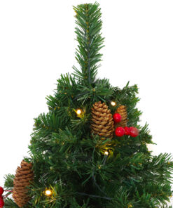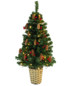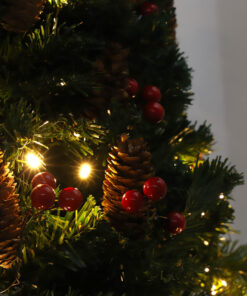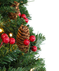 - The decorated tree features natural pine cones, red berries and warm white LED lights.