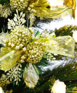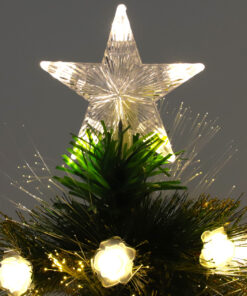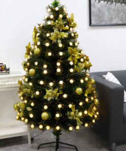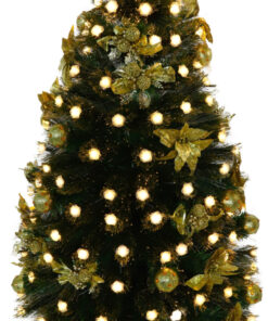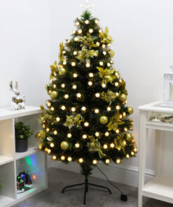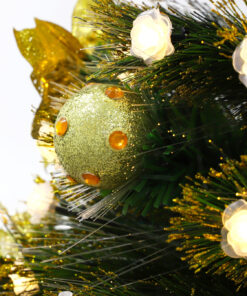 This Christmas tree is stunning and will look amazing in any household or workplace! The tree is green and is decorated with gold baubles, poinsettia flowers and other gold decoration. It also has a light up tree top star. There are led roses which make this tree even more beautiful. This amazing Christmas tree also has multi function led lights. The led lights are warm white colour which is like a fairy light colour. Led lights are very bright, low voltage and energy efficient. It comes with a foldable metal base and an indoor transformer which has 1.8m lead wire. Designed and manufactured by Christmas Concepts Ltd.