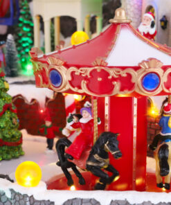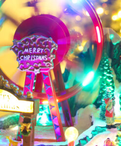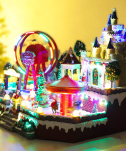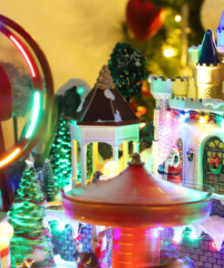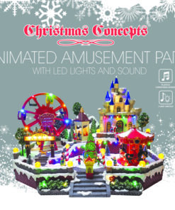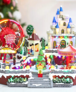 This stunning animated musical theme park is guaranteed to add some magic to your Christmas décor this year. Measuring 60x40x40cm it will be the perfect centre piece. The Park includes everything a real theme park would: a grand fairy-tale castle, 12 trees and 17 villagers. It even has 3 animated attractions: Ferris wheel, carousel and ice rink, beautifully illuminated with 78 static and chasing LED lights. All whilst playing 8 popular Christmas songs. Every little detail has been carefully hand painted: the cobble stone paths, brickwork and the happy festive expressions on the villagers faces. The snow covering the scene has also been topped with fine iridescent glitter. The scene comes with a 3-way switch: off, just lights and lights and music. Transformer: BS 4.5w 1200ma indoor plug with 1.8m lead wire.