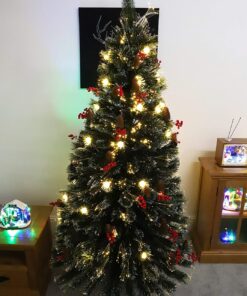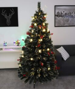 - It has frosted green branches with warm white led fibre optic lights and 58 warm white led berry lights. The tree also has red berries and pinecone decorations.