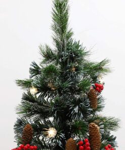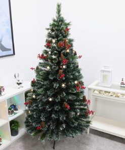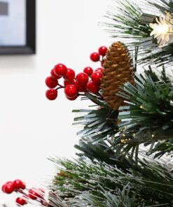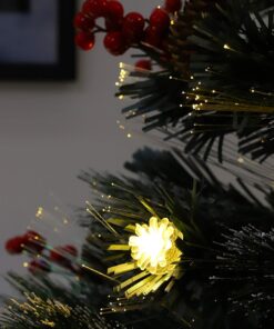 This is a stunning Christmas tree for any house or workplace. Decoration is not needed as this tree looks lovely just as it is. It has frosted green branches with warm white led fibre optic lights and 58 warm white led berry lights. The tree also has red berries and pinecone decorations. The tree has a foldable metal stand that measures 45cm. The tree girth is 80cm. Supplied with 3 pin transformer. 1.8m lead wire. Designed and manufactured by Christmas Concepts