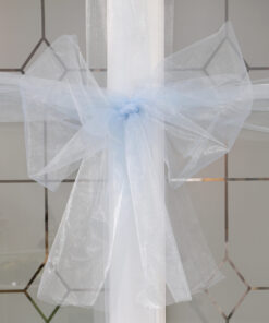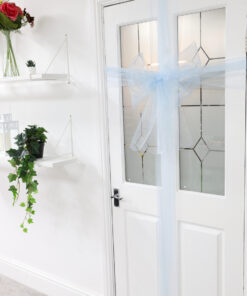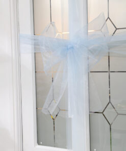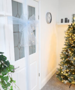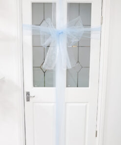 This Baby Blue organza fabric is perfect for making Christmas door bows. The Organza measures approximately 9M long and 40cm wide and has a sheer finish. Use this to decorate or make everything from Christmas door bows, Christmas trees, Christmas displays, Parties and can even be used to make bows for wedding chair covers and so much more. Designed and manufactured exclusively for Christmas Concepts Ltd. Instructions – What You’ll Need: Scissors Safety Pins or Stapler What to Do: 1. First, you want to create the perfect bow. Create this separately so that you can attach the fully tied piece to the door at the end. 2.Next you want to use the rest of the organza and start by posting the end over the top of your door, making sure the organza hits the bottom of the door on the front, and then post the remaining underneath the door, outwards. 3.Bring the organza up from the floor to the middle of your door, where your bow will be going. Take BOTH ends of the organza and cross them over. Imagine your tying a present up with ribbon. At this point your organza should have an ‘+’ in the middle of your door. 4.The two ends will now wrap around the width of your door. The side with your door handle on, wrap that end around the door handle to hold it tight while you do the next bit. Take the opposite end and post it through the hinge to the back of the door. 5.Untie the end that’s on your door handle and grab the end that is poking through the hinge – pull it all through to the back of the door. 6. Close your door and then do a knot in the centre of the door to keep it all in place. Cut off any excess, leaving a little bit hanging just to make it look a bit nicer. 7. Lastly, get your big bow and attach with pins or you can use a stapler. Fluff and arrange until you are happy with the overall look.