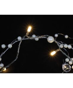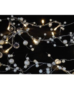 A gorgeous garland/ light set with 20 warm white LED lights. The garland has crystal ball like beads and ivory smaller beads throughout the garland. Very beautiful decoration which can be used as a garland on the wall, in the window, around flowers or around your Christmas tree. No wires as this is battery operated. LED lights are very bright, energy efficient and low voltage. Warm white led is a new colour for this year, it is more of a clear bulb than a bright white like an old fairy light colour, but is an led bulb which is much safer and uses far less power. The lights take 3 AA batteries, not included.