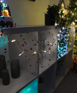 A gorgeous garland/ light set with 20 warm white LED lights. The garland has crystal ball like small and large beads throughout the garland. Very beautiful decoration which can be used as a garland on the wall, in the window, around flowers or around your Christmas tree. No wires as this is battery operated. LED lights are very bright, energy efficient and low voltage. Warm white led is a new colour for this year, it is more of a clear bulb than a bright white like an old fairy light colour, but is an led bulb which is much safer and uses far less power. These garlands are also perfect to decorate your wedding. The lights take 2 AA batteries, not included.