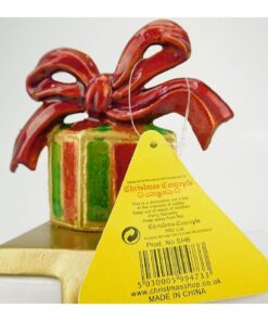 This beautifully designed stocking hanger would look great on the mantle piece this Christmas. The stocking hanger base is gold. The present is red, green and gold and has a shiny finish. The stocking hanger from top to bottom including hanger measures 15cm tall and 11cm across. Each stocking hanger is weighted as to not move when a stocking is hung on and the underside is covered with velvet-like material as to not harm any delicate surfaces.