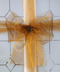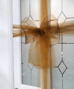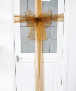 This Copper organza fabric is perfect for making Christmas door bows. The Organza measures approximately 9M long and 40cm wide and has a sheer finish. Use this to decorate or make everything from Christmas door bows, Christmas trees, Christmas displays, Parties and can even be used to make bows for wedding chair covers and so much more. Designed and manufactured exclusively for Christmas Concepts Ltd. Instructions – What You’ll Need: Scissors Safety Pins or Stapler What to Do: 1. First, you want to create the perfect bow. Create this separately so that you can attach the fully tied piece to the door at the end. 2.Next you want to use the rest of the organza and start by posting the end over the top of your door, making sure the organza hits the bottom of the door on the front, and then post the remaining underneath the door, outwards. 3.Bring the organza up from the floor to the middle of your door, where your bow will be going. Take BOTH ends of the organza and cross them over. Imagine your tying a present up with ribbon. At this point your organza should have an ‘+’ in the middle of your door. 4.The two ends will now wrap around the width of your door. The side with your door handle on, wrap that end around the door handle to hold it tight while you do the next bit. Take the opposite end and post it through the hinge to the back of the door. 5.Untie the end that’s on your door handle and grab the end that is poking through the hinge – pull it all through to the back of the door. 6. Close your door and then do a knot in the centre of the door to keep it all in place. Cut off any excess, leaving a little bit hanging just to make it look a bit nicer. 7. Lastly, get your big bow and attach with pins or you can use a stapler. Fluff and arrange until you are happy with the overall look.