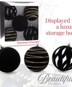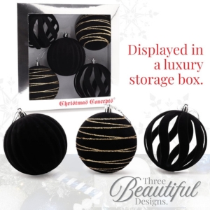 Create a stunning Christmas display or make a statement on your Christmas tree with these large beautiful baubles from Christmas Concepts Elegance collection. Each bauble measures 100mm (4″) and comes in 3 assorted elegant designs, including velvet, velvet with glitter stripes and velvet swirl. The baubles come complete with a silver box which you can store your luxury baubles in year after year. Made from the highest quality materials, these baubles are perfectly safe around children and pets without the risk of shattering. Each baubles comes ready for hanging with a metallic string loop attachment. You will receive 5 baubles in this set. Designed and manufactured exclusively for Christmas Concepts Ltd