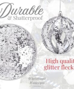 Create a stunning Christmas display or make a statement on your Christmas tree with these large beautiful baubles from Christmas Concepts Elegance collection. Each bauble measures 100mm (4″) and comes in 2 assorted elegant designs, all glitter and glitter swirl. The baubles come complete with a silver box which you can store your luxury baubles in year after year. Made from the highest quality materials, these baubles are perfectly safe around children and pets without the risk of shattering. Each baubles comes ready for hanging with a metallic string loop attachment. You will receive 5 baubles in this set. Designed and manufactured exclusively for Christmas Concepts Ltd