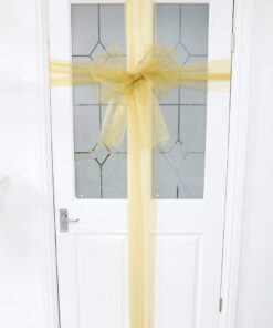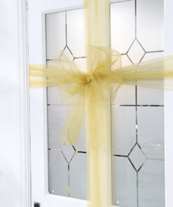 This Gold organza fabric is perfect for making Christmas door bows. The Organza measures approximately 9M long and 40cm wide and has a sheer finish. Use this to decorate or make everything from Christmas door bows, Christmas trees, Christmas displays, Parties and can even be used to make bows for wedding chair covers and so much more. Designed and manufactured exclusively for Christmas Concepts Ltd. *Please note that the diamantes are not included* Instructions – What You’ll Need: Scissors Safety Pins or Stapler What to Do: 1. First, you want to create the perfect bow. Create this separately so that you can attach the fully tied piece to the door at the end. 2.Next you want to use the rest of the organza and start by posting the end over the top of your door, making sure the organza hits the bottom of the door on the front, and then post the remaining underneath the door, outwards. 3.Bring the organza up from the floor to the middle of your door, where your bow will be going. Take BOTH ends of the organza and cross them over. Imagine your tying a present up with ribbon. At this point your organza should have an ‘+’ in the middle of your door. 4.The two ends will now wrap around the width of your door. The side with your door handle on, wrap that end around the door handle to hold it tight while you do the next bit. Take the opposite end and post it through the hinge to the back of the door. 5.Untie the end that’s on your door handle and grab the end that is poking through the hinge – pull it all through to the back of the door. 6. Close your door and then do a knot in the centre of the door to keep it all in place. Cut off any excess, leaving a little bit hanging just to make it look a bit nicer. 7. Lastly, get your big bow and attach with pins or you can use a stapler. Fluff and arrange until you are happy with the overall look.