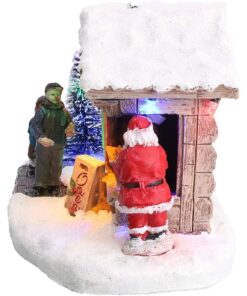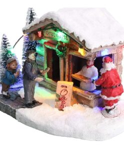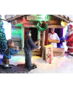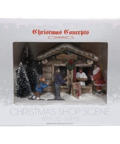 - Exclusive shop design with attached figurines, frosted trees and warming lights for a traditional Christmas feel