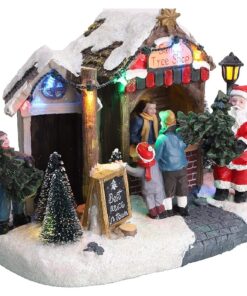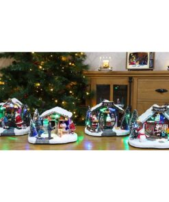 - Exclusive shop design with attached figurines, frosted trees and warming lights for a traditional Christmas feel