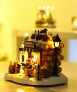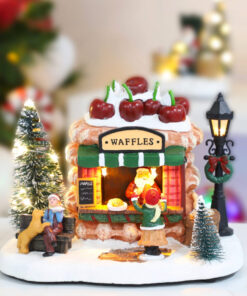 - Exclusive shop design with attached figurines, frosted trees and warming lights for a traditional Christmas feel