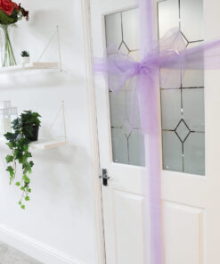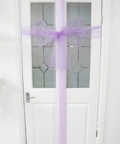 This Lilac organza fabric is perfect for making Christmas door bows. The Organza measures approximately 9M long and 40cm wide and has a sheer finish. Use this to decorate or make everything from Christmas door bows, Christmas trees, Christmas displays, Parties and can even be used to make bows for wedding chair covers and so much more. Designed and manufactured exclusively for Christmas Concepts Ltd. Instructions – What You’ll Need: Scissors Safety Pins or Stapler What to Do: 1. First, you want to create the perfect bow. Create this separately so that you can attach the fully tied piece to the door at the end. 2.Next you want to use the rest of the organza and start by posting the end over the top of your door, making sure the organza hits the bottom of the door on the front, and then post the remaining underneath the door, outwards. 3.Bring the organza up from the floor to the middle of your door, where your bow will be going. Take BOTH ends of the organza and cross them over. Imagine your tying a present up with ribbon. At this point your organza should have an ‘+’ in the middle of your door. 4.The two ends will now wrap around the width of your door. The side with your door handle on, wrap that end around the door handle to hold it tight while you do the next bit. Take the opposite end and post it through the hinge to the back of the door. 5.Untie the end that’s on your door handle and grab the end that is poking through the hinge – pull it all through to the back of the door. 6. Close your door and then do a knot in the centre of the door to keep it all in place. Cut off any excess, leaving a little bit hanging just to make it look a bit nicer. 7. Lastly, get your big bow and attach with pins or you can use a stapler. Fluff and arrange until you are happy with the overall look.