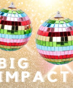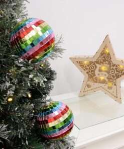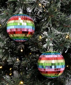 Create a beautiful Christmas display as twinkling fairy lights reflect off these retro disco ball style baubles. Each bauble measures 100mm (4″) and comes decorated with mini mirrored tiles and a string loop for easy hanging. Made of a lightweight polystyrene, perfect for a wide range of trees and garlands. You will receive 2 multi coloured disco baubles altogether. Designed and manufactured exclusively for Christmas Concepts Ltd