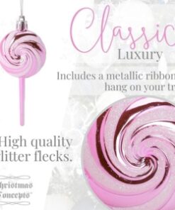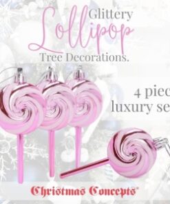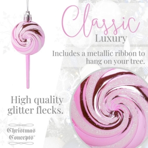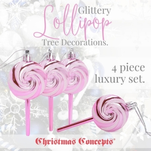 Add a sweet touch to your Christmas display with this pack of 4 Lollipop Christmas tree decorations. Each decoration is covered in a iridescent fine glitter, adding sparkle to your seasonal display. These baubles measure 11cm from top to bottom and come with a loop attachment for easy hanging. Whether nestled amongst the branches of your tree, decorating garlands & wreaths, or displayed in festive arrangements throughout your home, these lollipop baubles are sure to spread Christmas cheer. Designed and manufactured exclusively for Christmas Concepts Ltd.