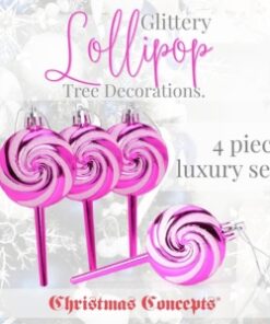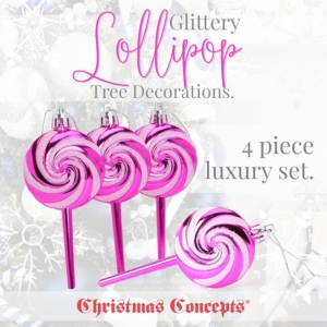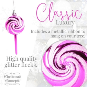 Add a sweet touch to your Christmas display with this pack of 4 Lollipop Christmas tree decorations. Each decoration is covered in a iridescent fine glitter, adding sparkle to your seasonal display. These baubles measure 11cm from top to bottom and come with a loop attachment for easy hanging. Whether nestled amongst the branches of your tree, decorating garlands & wreaths, or displayed in festive arrangements throughout your home, these lollipop baubles are sure to spread Christmas cheer. Designed and manufactured exclusively for Christmas Concepts Ltd.