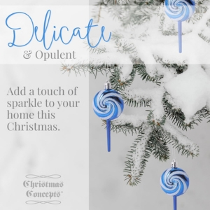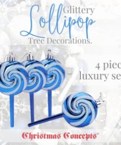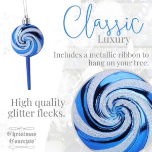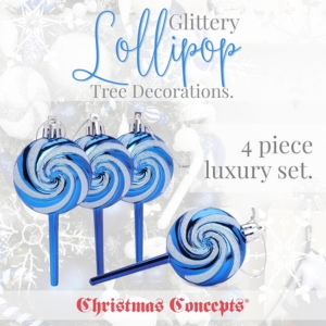 Add a sweet touch to your Christmas display with this pack of 4 Lollipop Christmas tree decorations. Each decoration is covered in a iridescent fine glitter, adding sparkle to your seasonal display. These baubles measure 11cm from top to bottom and come with a loop attachment for easy hanging. Whether nestled amongst the branches of your tree, decorating garlands & wreaths, or displayed in festive arrangements throughout your home, these lollipop baubles are sure to spread Christmas cheer. Designed and manufactured exclusively for Christmas Concepts Ltd.