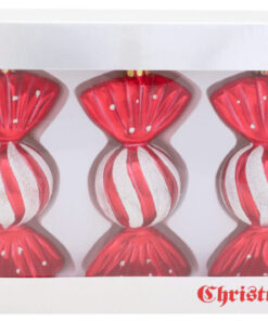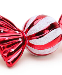 Each bauble comes decorated with a shiny base, glittery iridescent spotty ends and stripey centre.