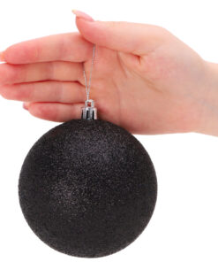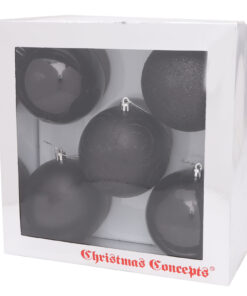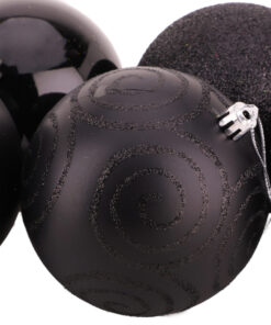 These beautiful shatterproof baubles are sure to brighten up any Christmas tree! They can also be used to make a garland by threading string or ribbon through the top and hanging them up in the window, from the mantle piece or on the wall. This pack contains 5 black baubles in total, including an assortment of glitter, matte, shiny and glitter swirl designs. Each bauble measures approximately 10cm and comes with a silver top with a silver string loop attached. Designed and manufactured exclusively for Christmas Concepts Ltd.