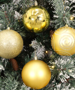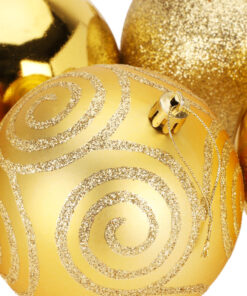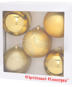 These beautiful shatterproof baubles are sure to brighten up any Christmas tree! They can also be used to make a garland by threading string or ribbon through the top and hanging them up in the window, from the mantle piece or on the wall. This pack contains 5 gold baubles in total, including an assortment of glitter, matte, shiny and glitter swirl designs. Each bauble measures approximately 10cm and comes with a gold top with a gold string loop attached. Designed and manufactured exclusively for Christmas Concepts Ltd.
