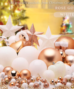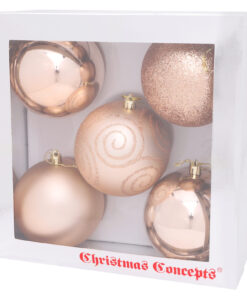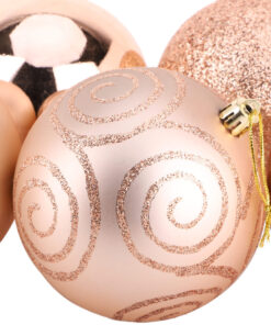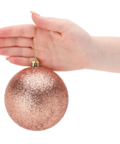 These beautiful shatterproof baubles are sure to brighten up any Christmas tree! They can also be used to make a garland by threading string or ribbon through the top and hanging them up in the window, from the mantle piece or on the wall. This pack contains 5 rose gold baubles in total, including an assortment of glitter, matte, shiny and glitter swirl designs. Each bauble measures approximately 10cm and comes with a gold top with a gold string loop attached. Designed and manufactured exclusively for Christmas Concepts Ltd.