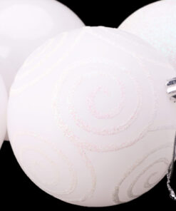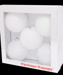 These beautiful shatterproof baubles are sure to brighten up any Christmas tree! They can also be used to make a garland by threading string or ribbon through the top and hanging them up in the window, from the mantle piece or on the wall. This pack contains 5 white baubles in total, including an assortment of glitter, matte, shiny and glitter swirl designs. Each bauble measures approximately 10cm and comes with a silver top with a silver string loop attached. Designed and manufactured exclusively for Christmas Concepts Ltd.
