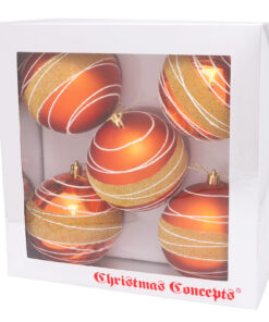 These beautiful shatterproof baubles are sure to brighten up any Christmas tree! They can also be used to make a garland by threading string or ribbon through the top and hanging them up in the window, from the mantle piece or on the wall. This pack contains 5 copper baubles in total, including an assortment of matte & shiny with gold beads and white glitter swirl designs. Each bauble measures approximately 10cm and comes with a gold top with a gold string loop attached. Designed and manufactured exclusively for Christmas Concepts Ltd.