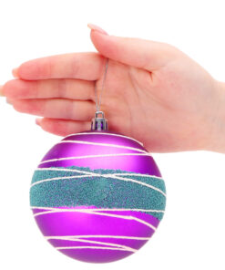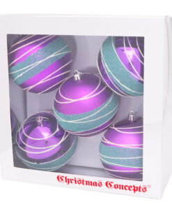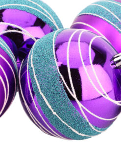 • This pack contains 5 purple baubles in total, including an assortment of matte & shiny with ice blue beads and white glitter swirl designs.
