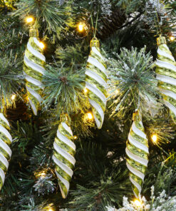 • Each bauble comes decorated with a shiny base and a glittery iridescent spiral pattern.