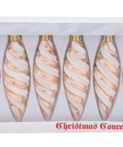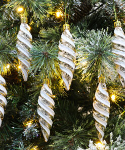 • Each bauble comes decorated with a shiny base and a glittery iridescent spiral pattern.
