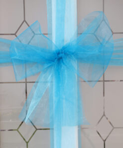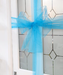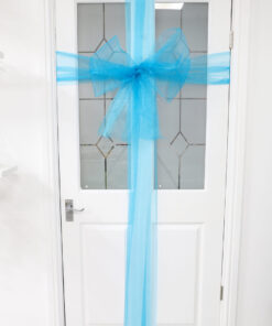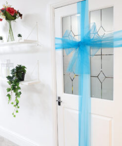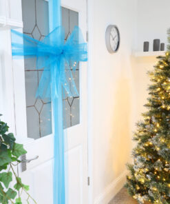 This Turquoise organza fabric is perfect for making Christmas door bows. The Organza measures approximately 9M long and 40cm wide and has a sheer finish. Use this to decorate or make everything from Christmas door bows, Christmas trees, Christmas displays, Parties and can even be used to make bows for wedding chair covers and so much more. Designed and manufactured exclusively for Christmas Concepts Ltd. Instructions – What You’ll Need: Scissors Safety Pins or Stapler What to Do: 1. First, you want to create the perfect bow. Create this separately so that you can attach the fully tied piece to the door at the end. 2.Next you want to use the rest of the organza and start by posting the end over the top of your door, making sure the organza hits the bottom of the door on the front, and then post the remaining underneath the door, outwards. 3.Bring the organza up from the floor to the middle of your door, where your bow will be going. Take BOTH ends of the organza and cross them over. Imagine your tying a present up with ribbon. At this point your organza should have an ‘+’ in the middle of your door. 4.The two ends will now wrap around the width of your door. The side with your door handle on, wrap that end around the door handle to hold it tight while you do the next bit. Take the opposite end and post it through the hinge to the back of the door. 5.Untie the end that’s on your door handle and grab the end that is poking through the hinge – pull it all through to the back of the door. 6. Close your door and then do a knot in the centre of the door to keep it all in place. Cut off any excess, leaving a little bit hanging just to make it look a bit nicer. 7. Lastly, get your big bow and attach with pins or you can use a stapler. Fluff and arrange until you are happy with the overall look.