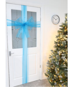 This Turquoise organza fabric is perfect for making Christmas door bows. The Organza measures approximately 9M long and 40cm wide and has a sheer finish. Use this to decorate or make everything from Christmas door bows, Christmas trees, Christmas displays, Parties and can even be used to make bows for wedding chair covers and so much more. Designed and manufactured exclusively for Christmas Concepts Ltd. Instructions – What You’ll Need: Scissors Safety Pins or Stapler What to Do: 1. First, you want to create the perfect bow. Create this separately so that you can attach the fully tied piece to the door at the end. 2.Next you want to use the rest of the organza and start by posting the end over the top of your door, making sure the organza hits the bottom of the door on the front, and then post the remaining underneath the door, outwards. 3.Bring the organza up from the floor to the middle of your door, where your bow will be going. Take BOTH ends of the organza and cross them over. Imagine your tying a present up with ribbon. At this point your organza should have an ‘+’ in the middle of your door. 4.The two ends will now wrap around the width of your door. The side with your door handle on, wrap that end around the door handle to hold it tight while you do the next bit. Take the opposite end and post it through the hinge to the back of the door. 5.Untie the end that’s on your door handle and grab the end that is poking through the hinge – pull it all through to the back of the door. 6. Close your door and then do a knot in the centre of the door to keep it all in place. Cut off any excess, leaving a little bit hanging just to make it look a bit nicer. 7. Lastly, get your big bow and attach with pins or you can use a stapler. Fluff and arrange until you are happy with the overall look.