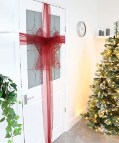 This organza fabric is perfect for making Valentines door bows. The Organza measures approximately 9M long and 40cm wide and has a sheer finish. Designed and manufactured exclusively for Christmas Concepts Ltd. Instructions – What You’ll Need: Scissors Safety Pins or Stapler What to Do: 1. First, you want to create the perfect bow. Create this separately so that you can attach the fully tied piece to the door at the end. 2.Next you want to use the rest of the organza and start by posting the end over the top of your door, making sure the organza hits the bottom of the door on the front, and then post the remaining underneath the door, outwards. 3.Bring the organza up from the floor to the middle of your door, where your bow will be going. Take BOTH ends of the organza and cross them over. Imagine your tying a present up with ribbon. At this point your organza should have an ‘+’ in the middle of your door. 4.The two ends will now wrap around the width of your door. The side with your door handle on, wrap that end around the door handle to hold it tight while you do the next bit. Take the opposite end and post it through the hinge to the back of the door. 5.Untie the end that’s on your door handle and grab the end that is poking through the hinge – pull it all through to the back of the door. 6. Close your door and then do a knot in the centre of the door to keep it all in place. Cut off any excess, leaving a little bit hanging just to make it look a bit nicer. 7. Lastly, get your big bow and attach with pins or you can use a stapler. Fluff and arrange until you are happy with the overall look.