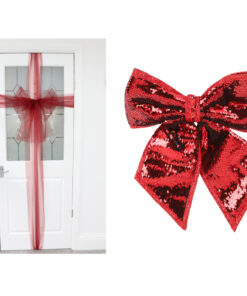 - Includes: 9m x 40cm Sheer Finish Organza – 30cm Red & Gold Sequin Bow