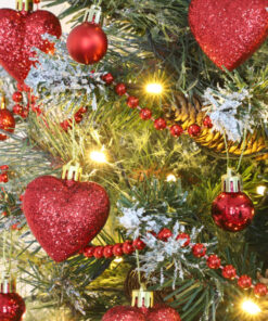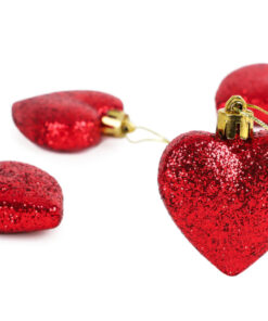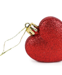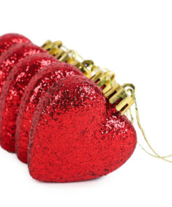 - This pack contains 8 heart baubles in total, decorated with a red glitter design.