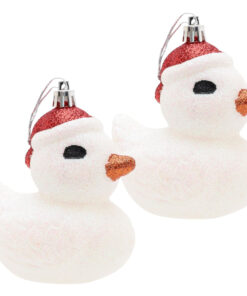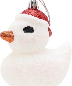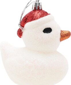 - Transform your Christmas tree with these delightful duck baubles! Each bauble is coated with white glitter and adorned with a dapper Santa hat, adding a touch of festive flair to your seasonal display.