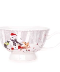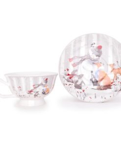 - This luxury cup & saucer set is decorated with a festive Snowman in a winter wonderland setting, with his forest friends, packaged in a luxury matching gift/storage box.