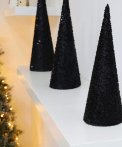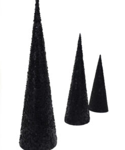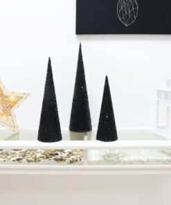 Bring some glitz into your home this Christmas with this set of 3 cone trees! Made from durable PVC, the trees are decorated in black sequins and beads. The small tree measures 30cm x 11 cm diameter, the medium tree is 39cm x 12.5cm diameter and the large tree is 46.5cm x 14cm diameter. The decorations are very light and can be arranged to your personal taste. These trees would look great as a Christmas dinner table centre piece or standing on a mantle piece or window sill! Designed and manufactured exclusivley for Christmas Concepts Ltd.