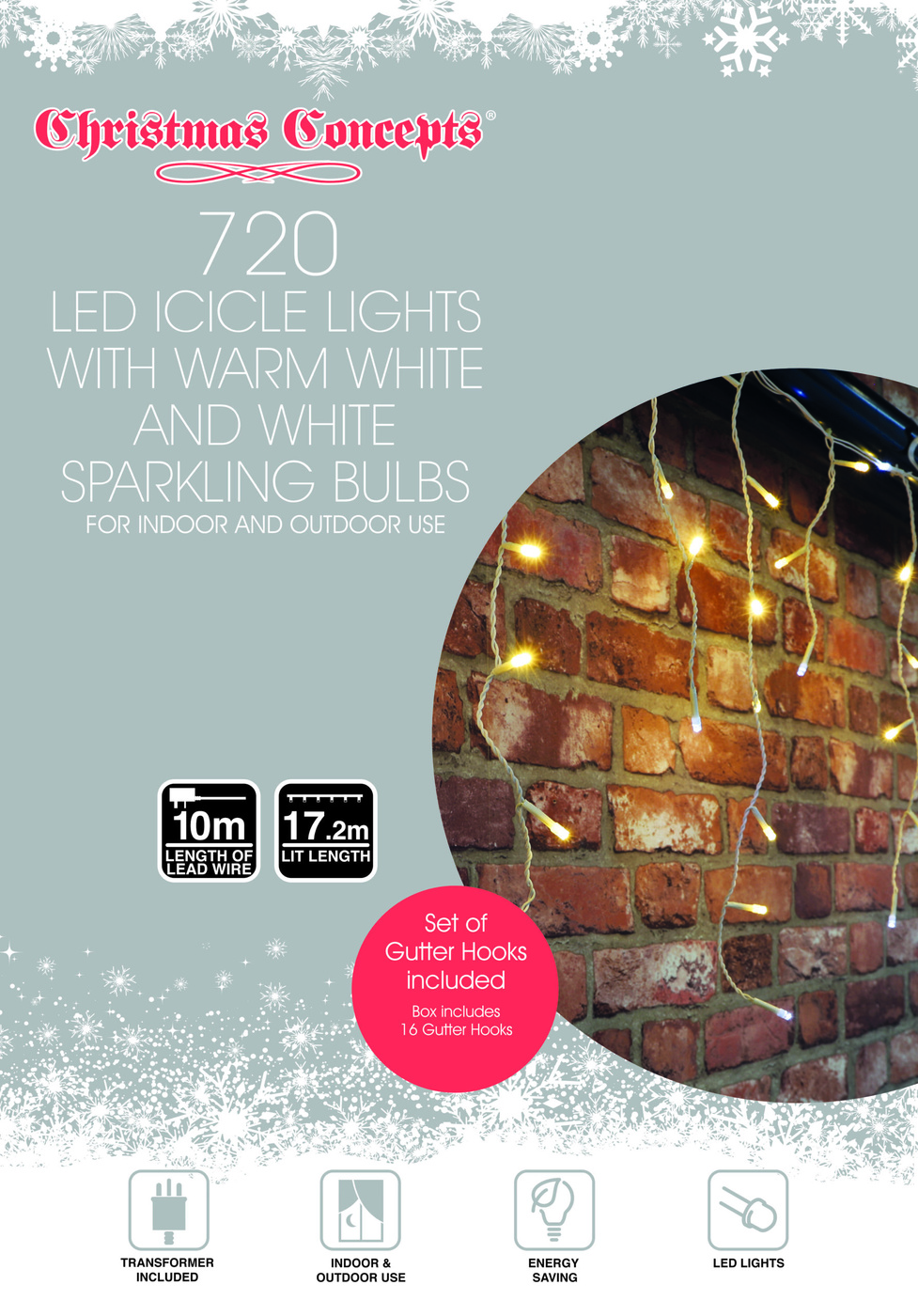 Make all your neighbours jealous this year with these stunning warm white and white twinkle effect lights, perfect for both indoors and outdoors. The warm white LED lights are static while the bright white lights twinkle resulting in a stunning effect. The lights measure 17.2m/56ft. They also come with a long 10m/33ft lead wire to help reach them far away plugs. The lights come in a durable storage box; keeping them in great condition to use year after year. BS indoor transformer. Super energy efficient giving you one the the highest energy ratings saving you money year after year. Designed and manufactured by Christmas Concepts Ltd.